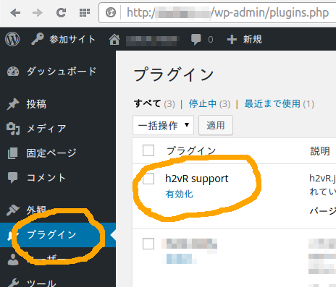 次に、このプラグインを有効化するために、WordPressのダッシュボードにログイン。プラグインメニューに移動すると、"h2vR support" というプラグインがリスト内に見つかるはずです。